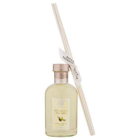 Antica Farmacista Lemon, Verbena & Cedar Diffuser is the signature product in our collection. Utilizing apothecary inspired bottles filled with exquisite fragrance, the scent permeates the air via our signature reeds which are inserted into the bottle. The reeds absorb the fragrance and subtly distribute it throughout the air, providing lasting, beautiful scent. Customize the intensity by flipping the reeds — flip every day for more intense scent or once a week for more subtle fragrance.