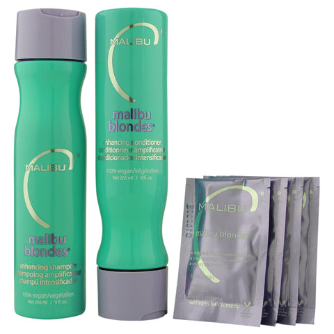 Shampoo and condition daily with Malibu C Blondes Wellness Shampoo and Conditioner. Activate and apply Malibu C Blondes Natural Wellness Treatment once a week. Leave in for 2-5 minutes then rinse.