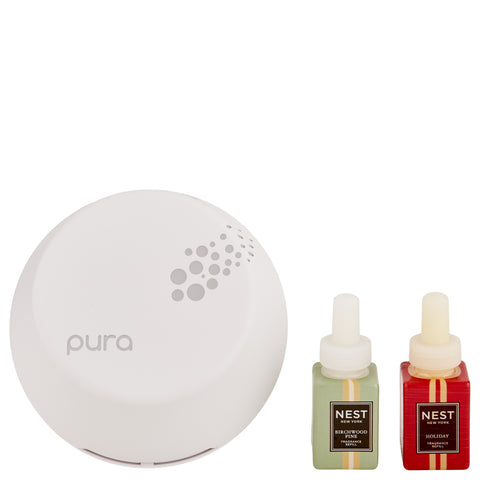 Nest Fragrances Pura Smart Home Fragrance Diffuser Set with Holiday & Birchwood Pine Refills allows you to control preferences and intensity from your phone, set custom schedules, and adjust scent intensity from anywhere. The device holds two vials that last up to 700 hours and can be swapped out for refills. It is Alexa-compatible and features geo-location technology that allows your home to be scented upon arrival and turns off after departure.